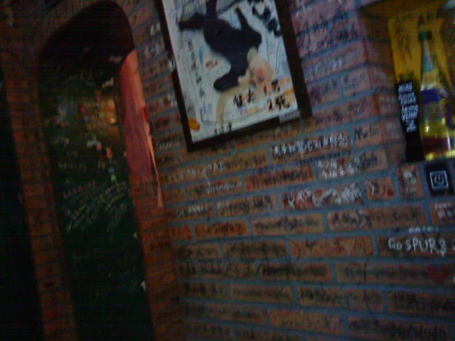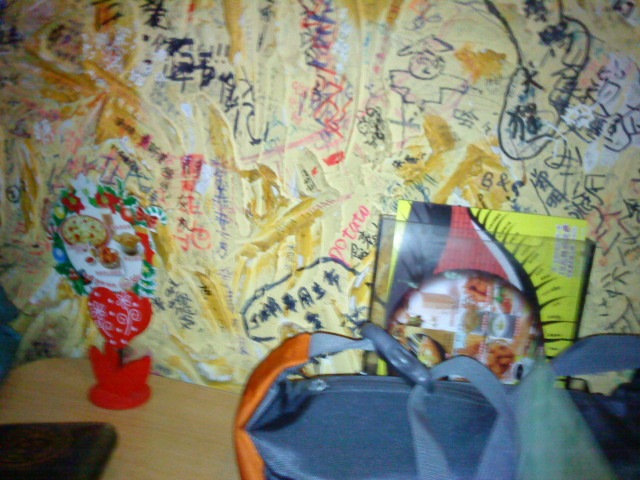 晚上去了“猫眼”吃披萨,哎,人家是去品尝披萨的,可惜我们几个是“去吃饭”的,吃撑了,要真说这家店的披萨怎么样自己还真无法形容……“非主流”的文化气息还是很浓的,墙上包括厕所都写满了文字,无非是些友情和爱情的祝福或者描述。
